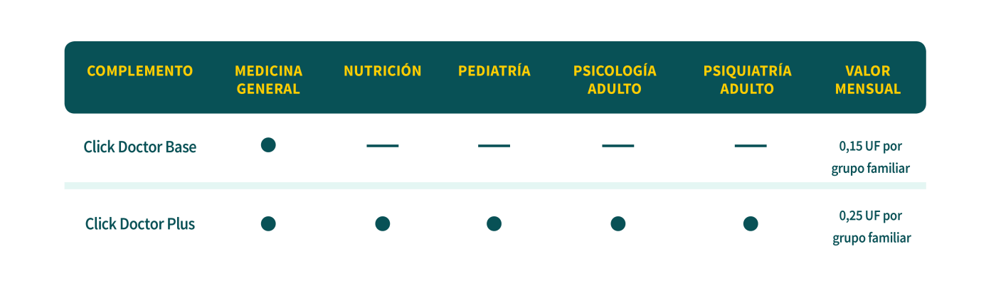 Contrata cualquiera de los productos detallados ingresando a tu Sucursal Digital y de esta forma tendrás acceso a consultas de Medicina General Adulto ilimitadas, las 24 horas del día a través de CLICK DOCTOR BASE, o además contar, con 6 consultas al mes para atenciones de Nutrición (Nutricionista), Pediatría, Psicología Adulto y Psiquiatría Adulto (por grupo familiar) con agendamiento previo a través de CLICK DOCTOR PLUS.