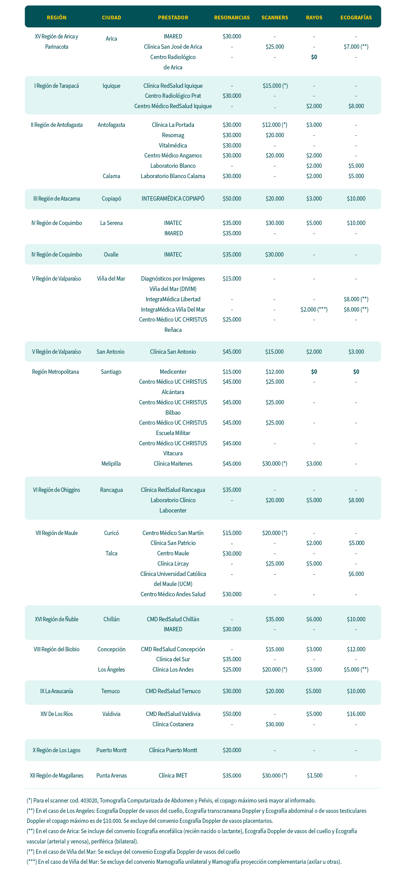 (*) El copago en imágenes es máximo, es decir, dependiendo de tu plan, éste incluso podría ser menor. Pueden existir tipos de imágenes específicas que se encuentren fuera de los copagos informados. Los copagos máximos señalados tienen una vigencia temporal, pudiendo modificarse y/o eliminarse en el futuro. Beneficio aplica sólo para prestaciones que los prestadores realicen en cada sucursal. No aplica para planes cerrados. No aplica mediante reembolso.